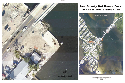 Bat House Park is located at the southwest corner of Matlacha Bridge next to Gold Key Properties. The planned park includes all that remains of the Old Snook Inn. The Inn was built next to the Matlacha Bridge in the late 1930s and was originally a fish house that became a restaurant. In 2009, a fire started in the tike hut of the restaurant and destroyed most of the building. Today the small portion that remains is considered a historic property.