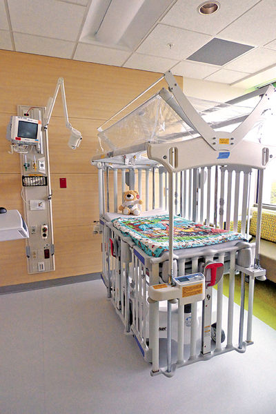 The third floor has 64 NICU beds, which are divided into “neighborhoods” complete with lights outside of the rooms. The average nurse to patient ratio is two to one with a nurse station between the two rooms.