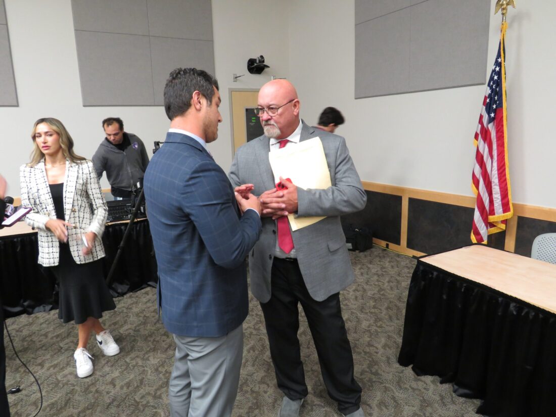 Rep. Mike Giallombardo (at left) speaks with Lee County Board of County Commissioners Chair Mike Greenwell after Lee County delegation meeting in November, 2023.