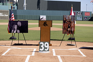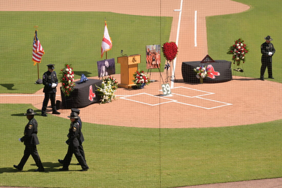 Greenwell and his wife Tracy were together for 45 years. When Tracy and the family entered JetBlue Stadium, they symbolically entered from left field. Tracy entered the stadium first, accompanied by two of her grandsons, Brooks and Gage. Tracy was followed by the couple’s sons, Bo and Garrett Greenwell. Bo’s wife, Brittany, the couple’s son, Brady, and Garrett’s wife, Paige, and the couple’s daughter, Paizlee. The two oldest grandsons, each holding one of Grandma Tracy’s hands, jumped over the white chalk-line leading from home base to third base. This show of respect for the white chalk line seemed to simply be part of growing-up as a Greenwell.