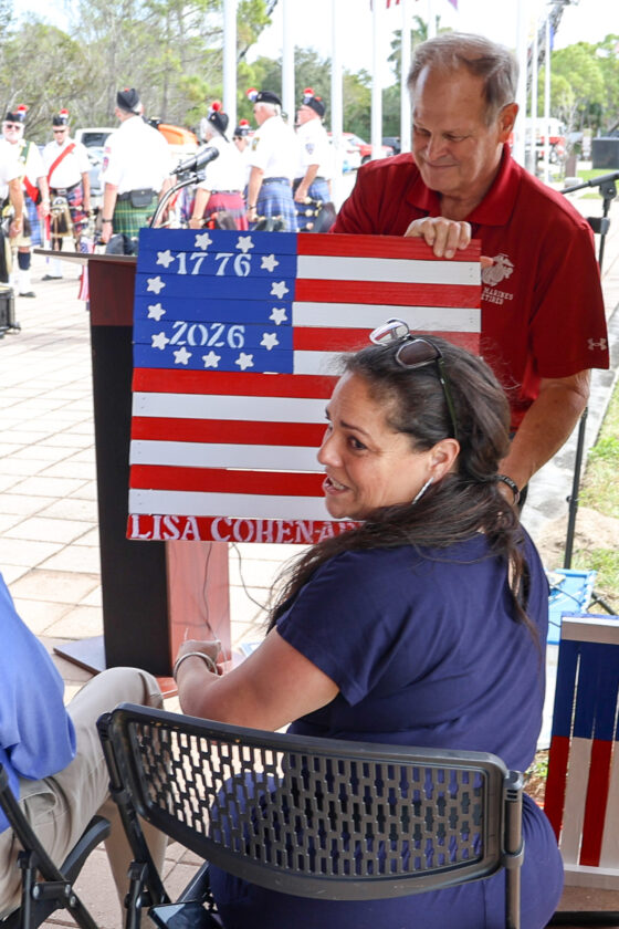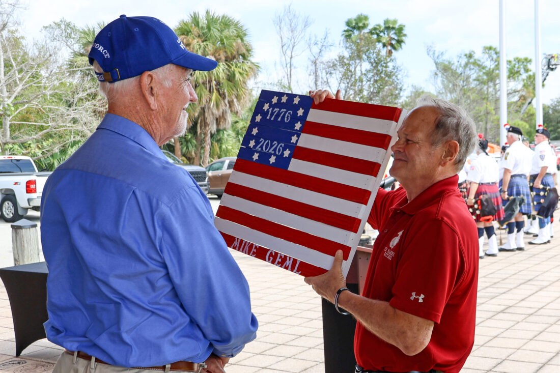 Mike Pedersen presents Lisa Cohen Adkinson with a “Besty Ross” flag replica for her work on the Iwo Jima monument in Cape Coral. MARK CLIFFORD