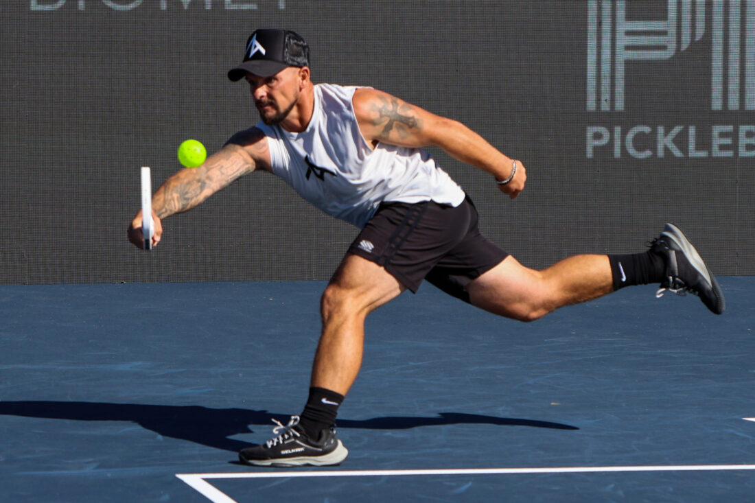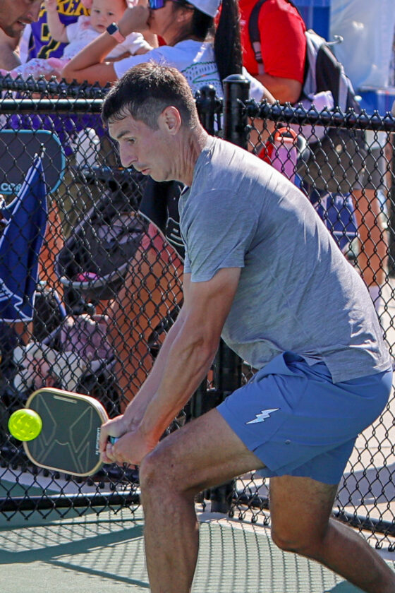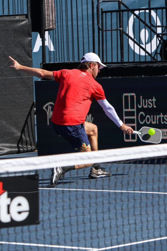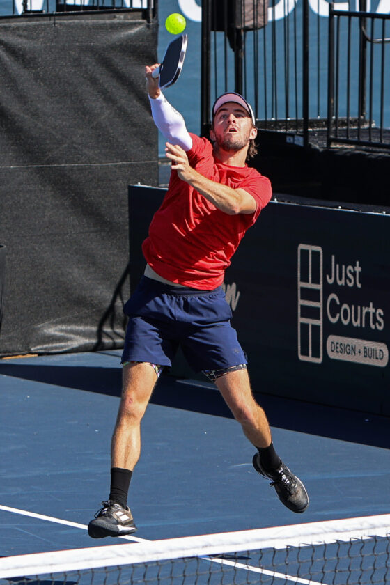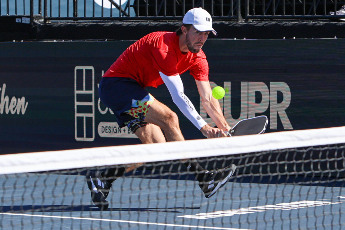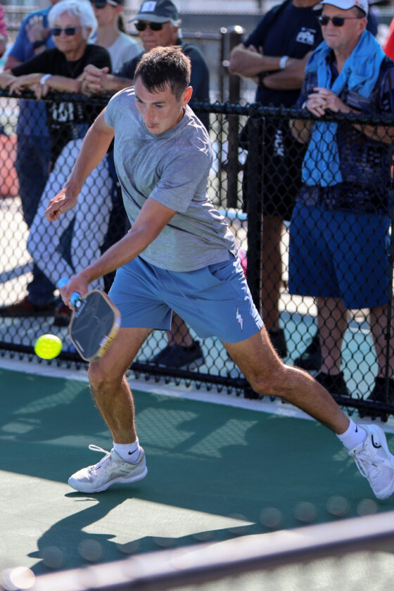 Hunter Johnson looks to see where his opponent Spartak Rahachou is while making a soft “dump shot” near the net. MARK CLIFFORD