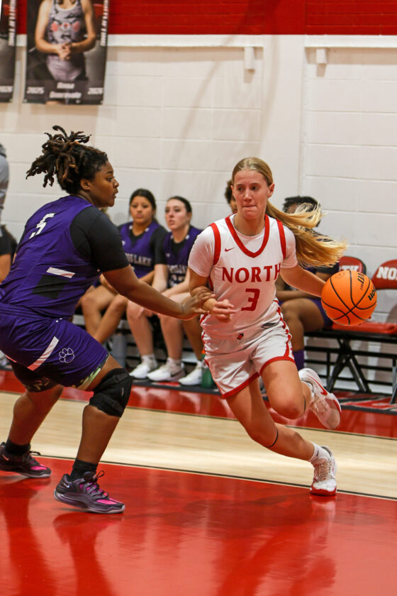 North Fort Myers forward Lily Erickson uses a cross-over dribble to get past Triton defender Maya Wilson. MARK CLIFFORD