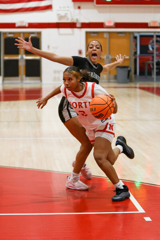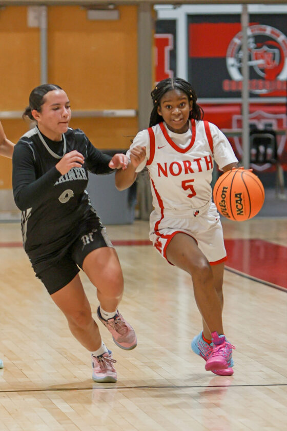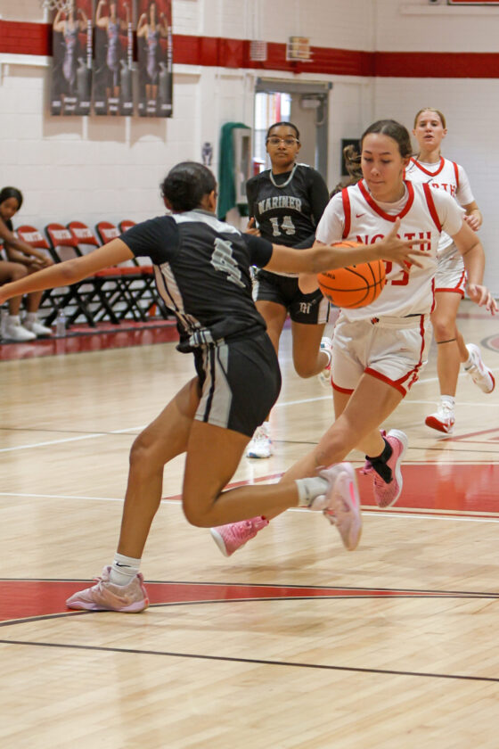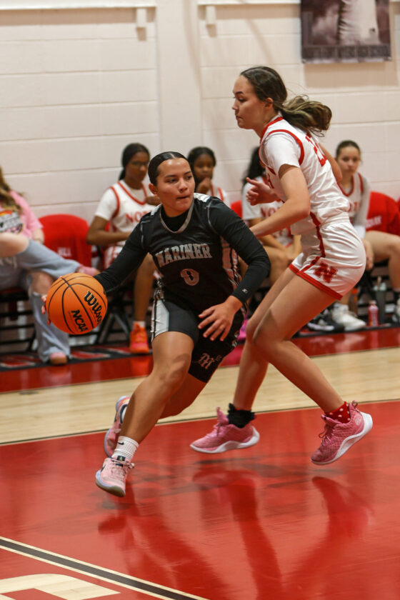 Red Knight guard Tiana Hill dribbles past Mariner defender Maya Wilson at the top of the key and heads to the basket. MARK CLIFFORD