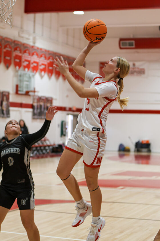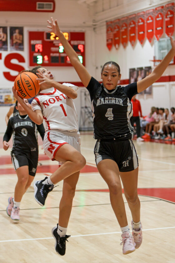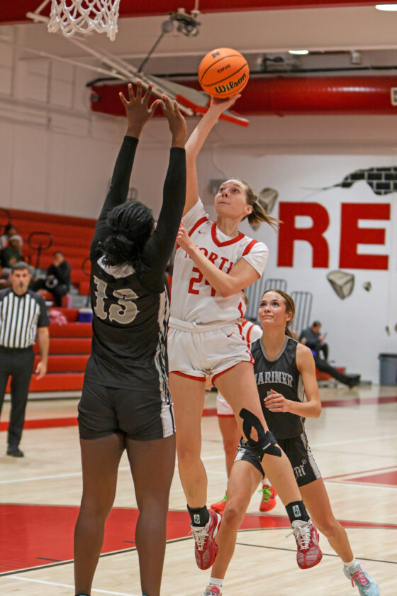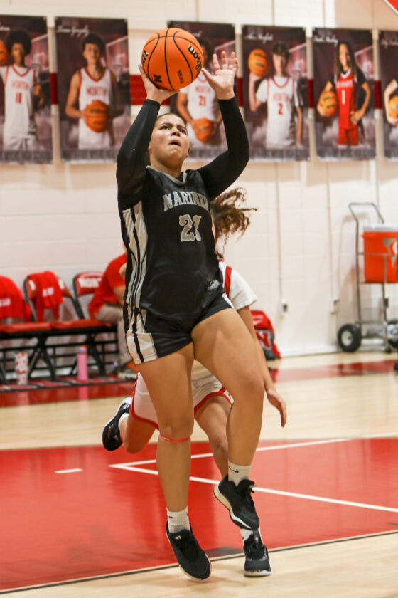 Mariner’s Gabriella Silva looks on as Red Knight guard Kelley Conley goes airborne and puts up the one-handed jump shot. MARK CLIFFORD