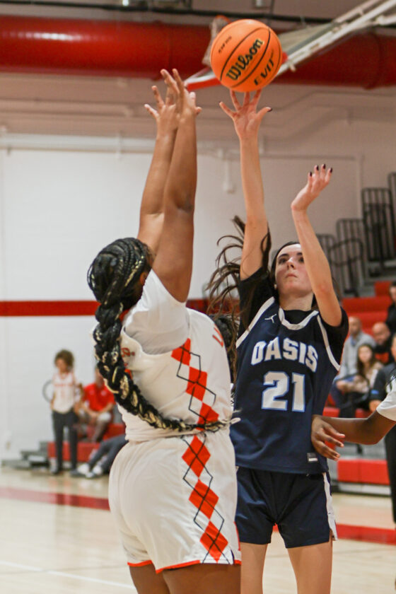 Oasis guard Katelynn Jakubowski puts up the shot against the tight defense of Dunbar’s Arnya Jackson. MARK CLIFFORD