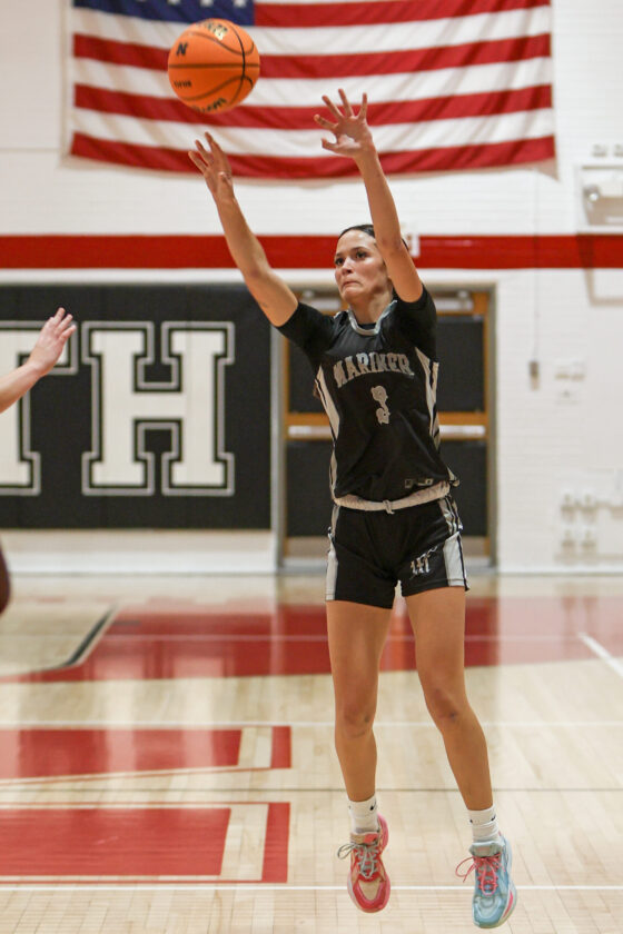 Red Knight guard Faith MacKay shoots a floating “one-handed” jump shot over Mariner defender Candice Cooper (21) while her teammate Gabriella Silva (0) watches in the background. MARK CLIFFORD