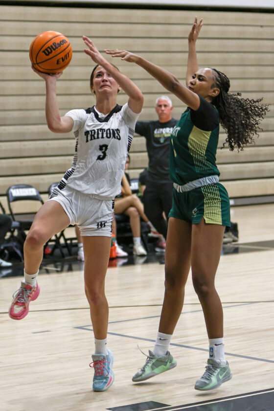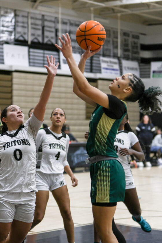 Island Coast guard Nevaeh Janet-lynn Howard shoots the one-hand jump shot and scores two points over the defense of Mariner guard Gabriella Silva. Looking on in the background is Triton forward Maya Wilson. MARK CLIFFORD