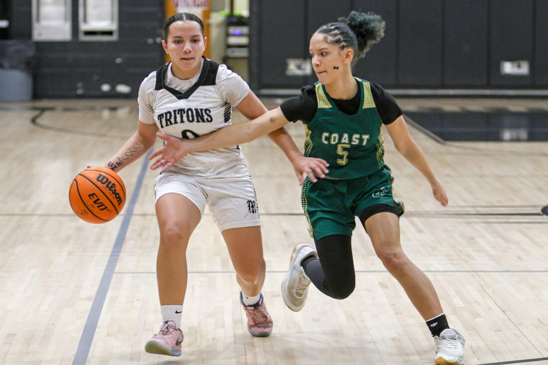 Island Coast guard Nevaeh Janet-lynn Howard tries to swipe the ball away from Triton guard Gabriella Silva as she dribbles down the sideline. MARK CLIFFORD