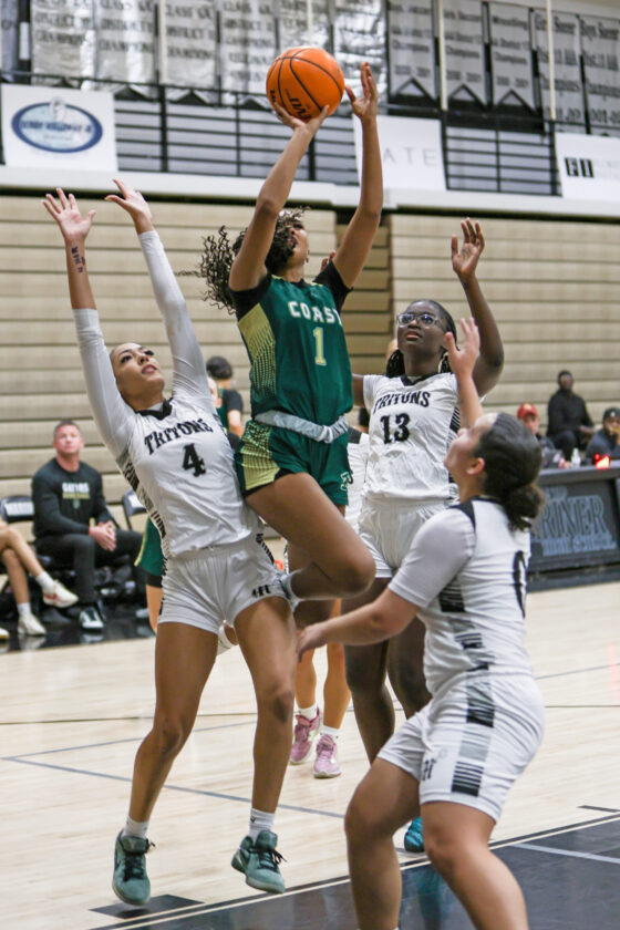 Island Coast guard Samarrah Desir flies past three Triton defenders and puts up an acrobatic one-hand shot. MARK CLIFFORD