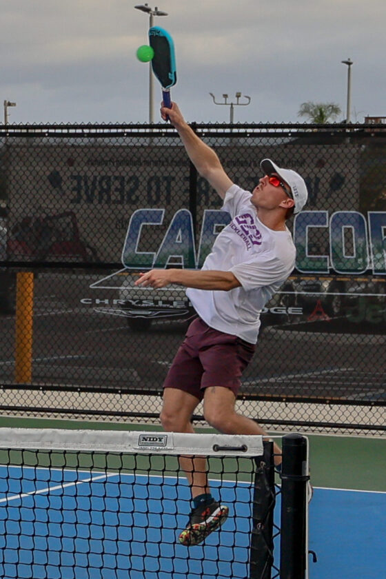 Brady Madrid of Utah Tech University goes to his backhand to make a save near the sideline in mixed doubles competition. MARK CLIFFORD