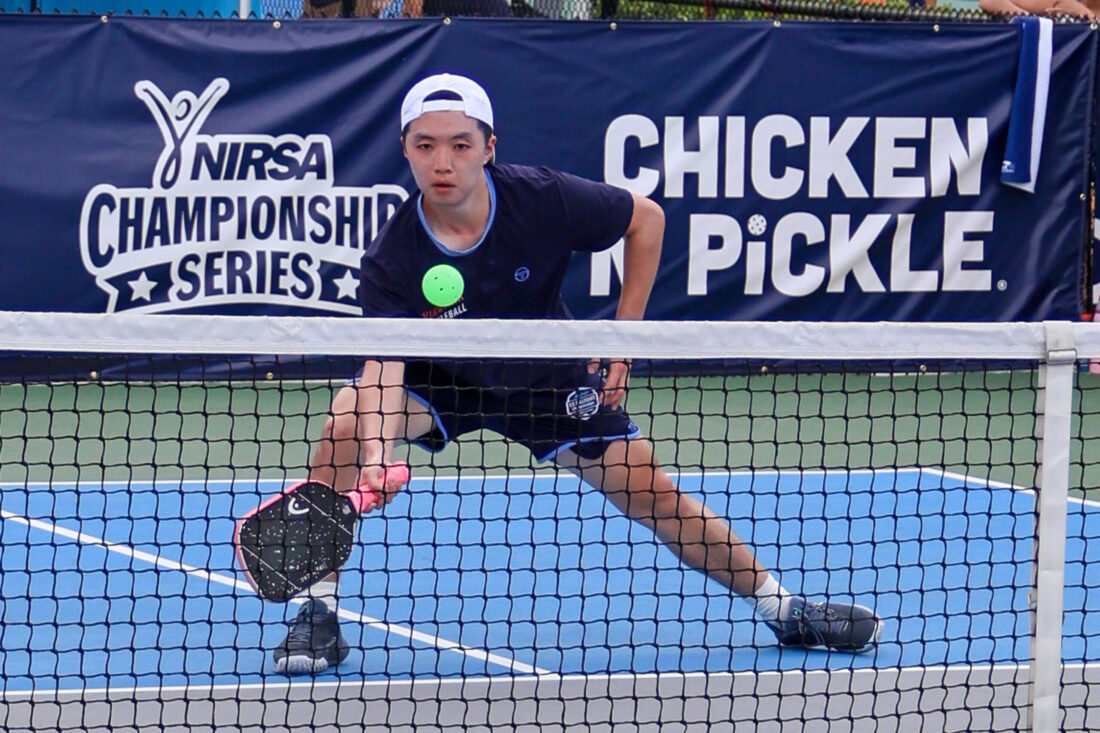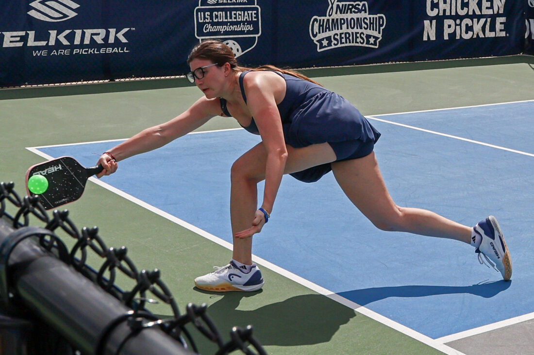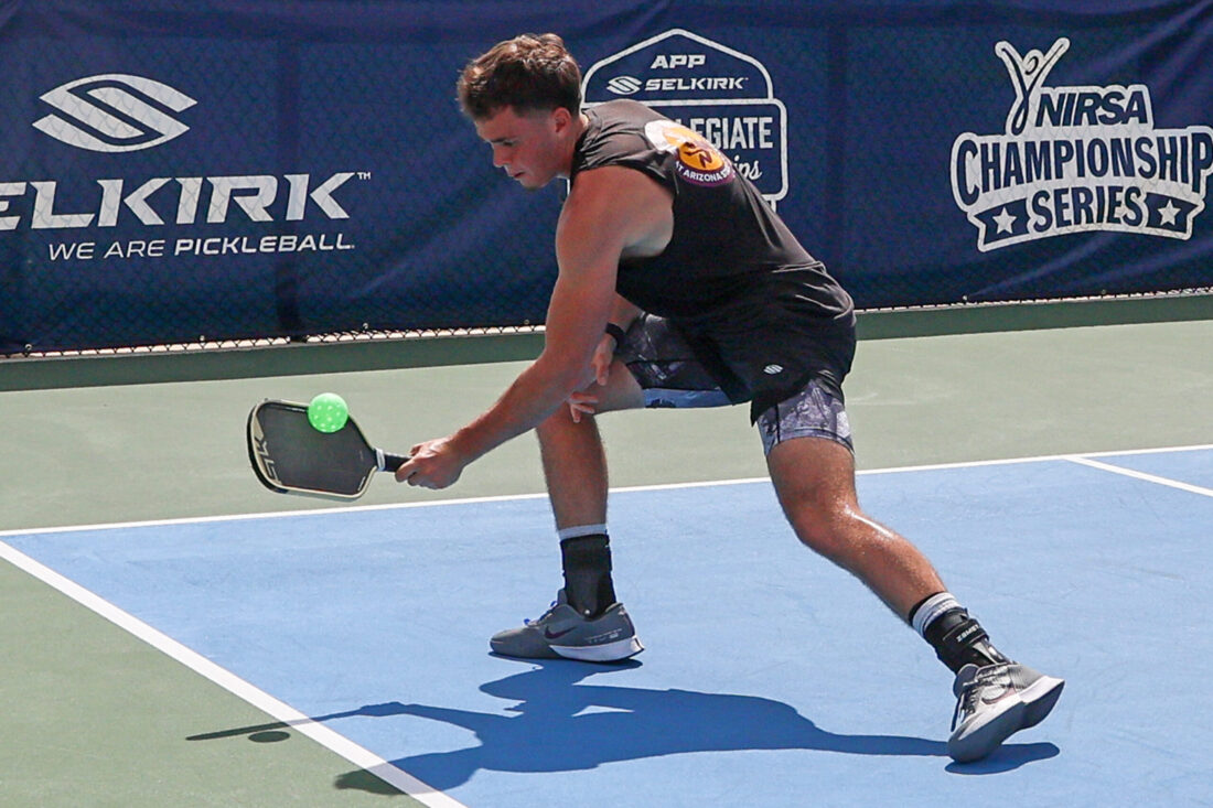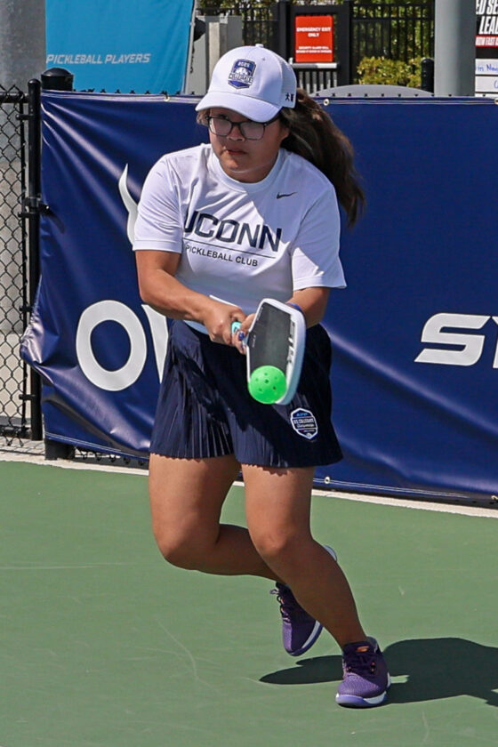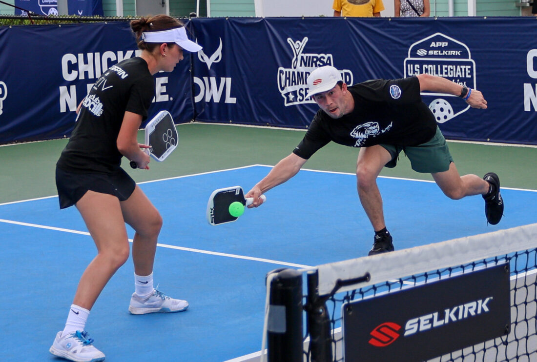 Gabe Bursztyn of the University of Connecticut uses an underhand lob shot in mixed doubles competition. MARK CLIFFORD