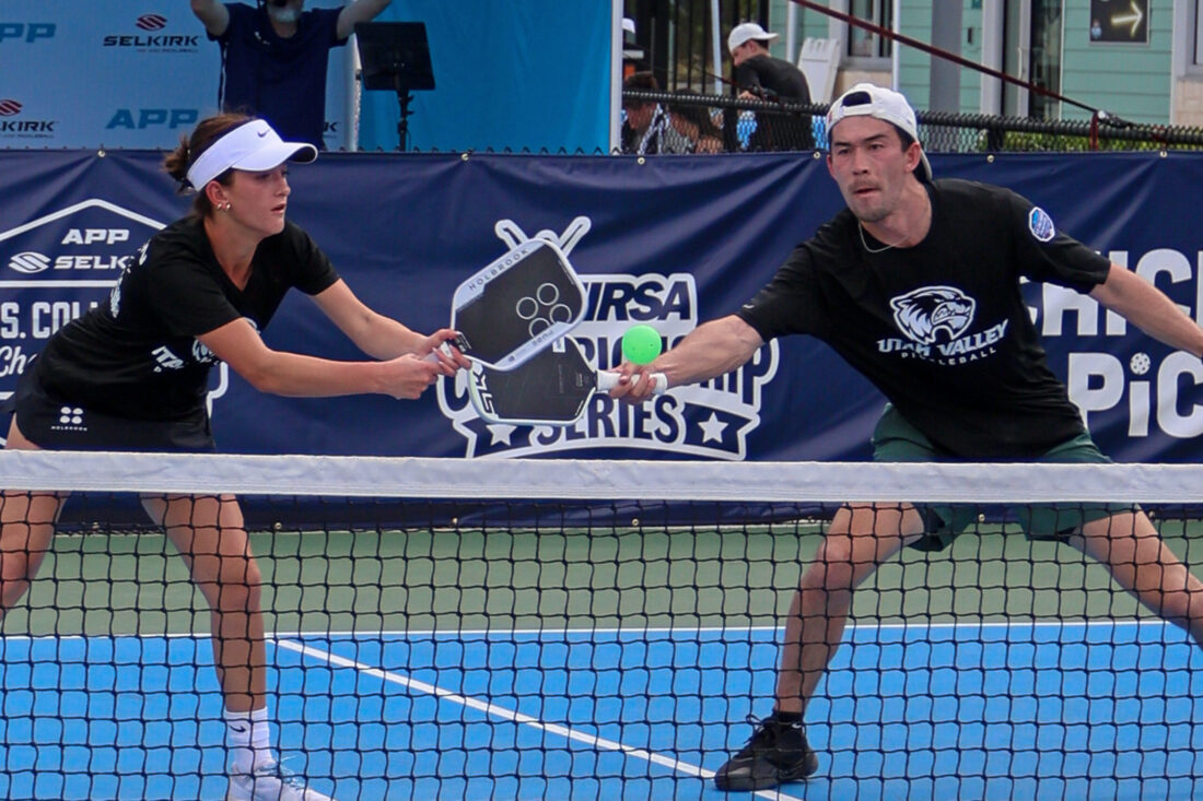 Brady Madrid and Dy;An Ciampini of Utah Tech University both try to return volley at the net in mixed doubles competition. MARK CLIFFORD