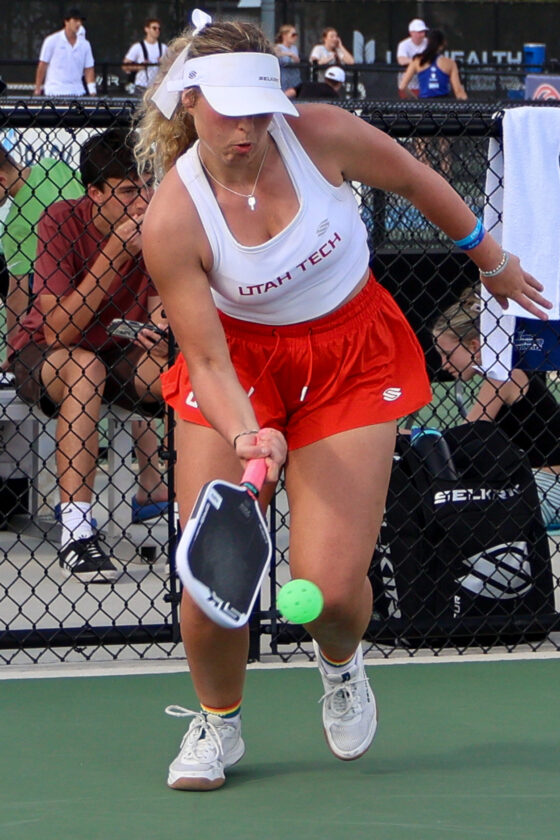 Dy;An Ciampini of Utah Tech University returns serve in mixed doubles competition. MARK CLIFFORD